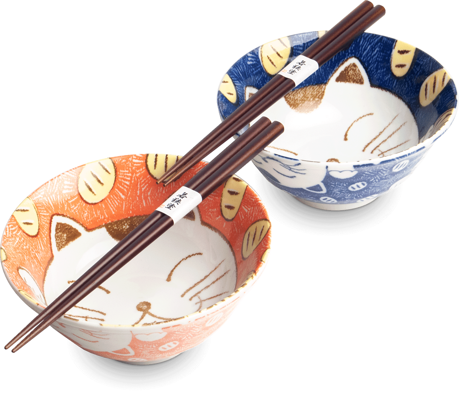 2-delige ramenbowlset met afbeelding van een kat.Inclusief 2 setjes chopsticks in een mooie zwarte geschenkdoos.