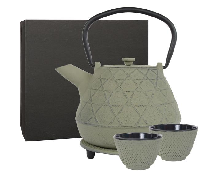 Groen/grijze gietijzeren theekan met onderzetter en 2 bijhorende theekopjes, in cadeauverpakking.