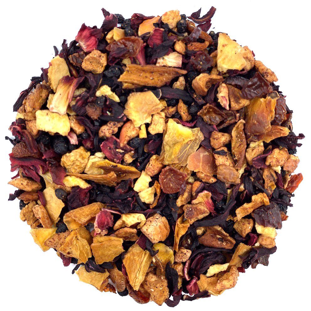 Ingrediënten: hibiscusbloesem, appelstukken , vlierbes, rozebottelblaadjes, papayavlokken, mangostukjes, aroma, maracujagranulaat (geconcentreerd sap van passievrucht, maltodextrine, sinaasappel)
