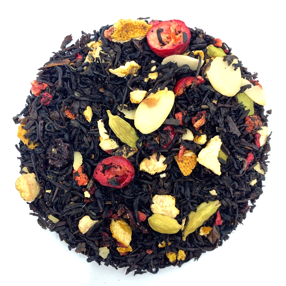 zwarte thee (69%), zeste van sinaasappel, stukjes cranberry (cranberry, suiker, zonnebloemolie), AMANDELschilfers, kardamom, aroma, gevriesdroogde aardbeistukken, gevriesdroogde frambozenstukken, gevriesdroogde cranberryschijven