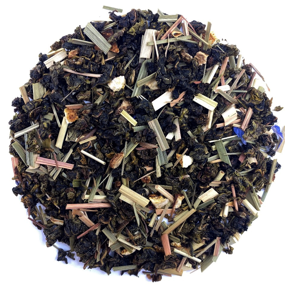 China Oolong, citroengras (16%), citroenschil (9%), natuurlijke aroma’s, blauwe korenbloem