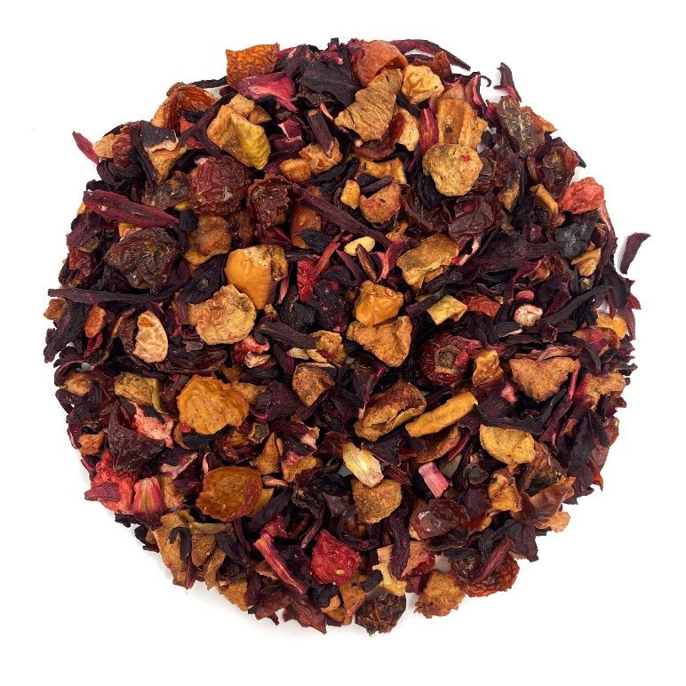 Ingrediënten: hibiscus, appel stukjes, rozenbottel schillen, aardbei stukjes (3%), aroma.