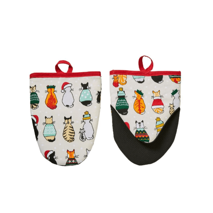 De Double Micro ovenwanten set is perfect voor het hanteren van hete potten en schalen tot 100 graden Celsius. De handpalmen van neopreen beschermen tegen stoom en heet water en helpen uw vingers veilig te houden bij het hanteren van uw nieuwste culinaire meesterwerk. Dit vrolijke ontwerp van Cats in Waiting in kerst variant is een lust voor het oog! De vrolijke kattenverzameling zorgt voor een glimlach op je gezicht. Een must voor de kattenliefhebber!