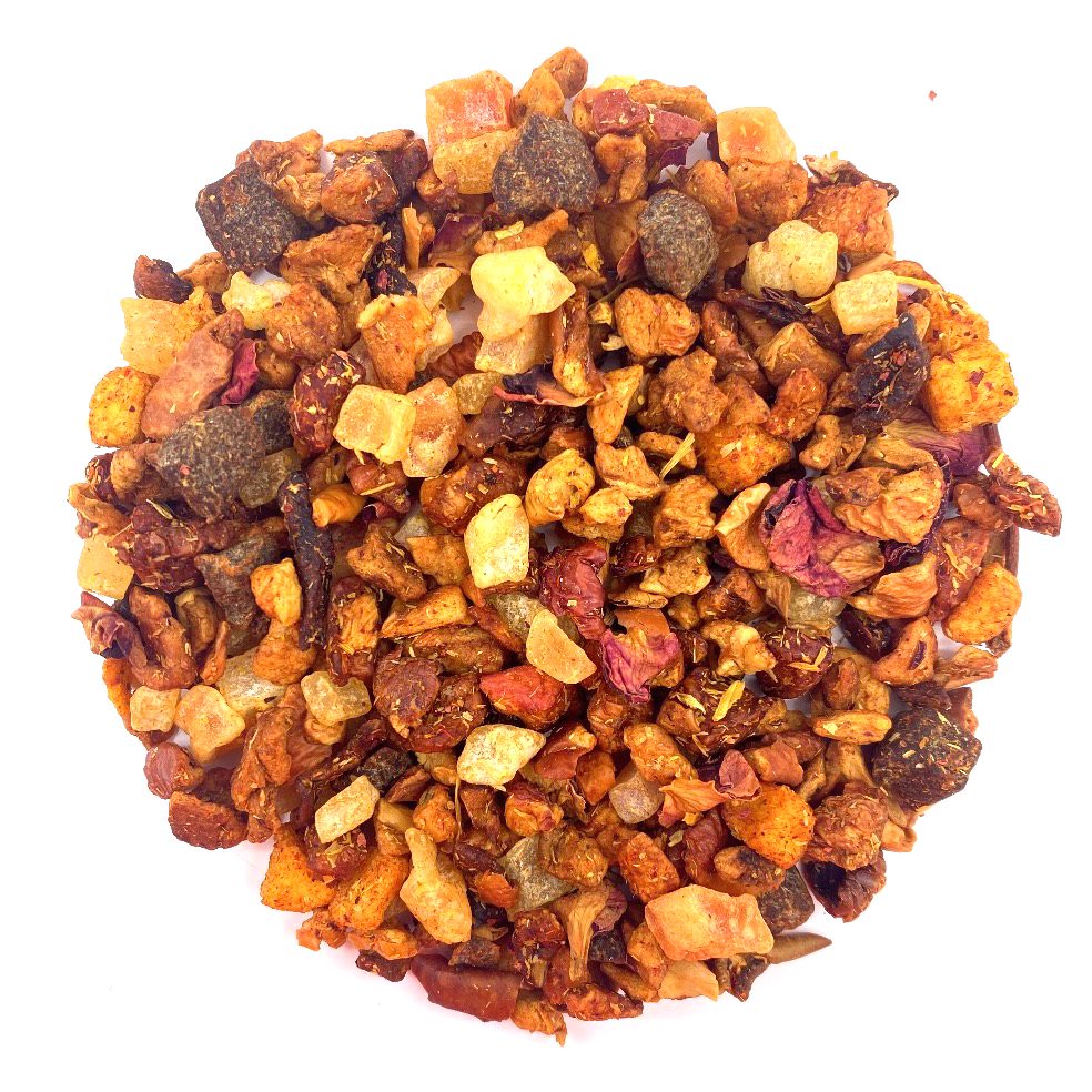 Een mix van zongerijpte perzik, stukjes zoete en zure appel, ananas en papaya stukjes. Een bonte kleurmengeling waaraan goudsbloem, saffloer en rozenblaadjes toegevoegd worden, die zorgen voor de perfecte en harmonieuze perzik beleving, een feest voor de smaakpapillen! Let's get this party started!