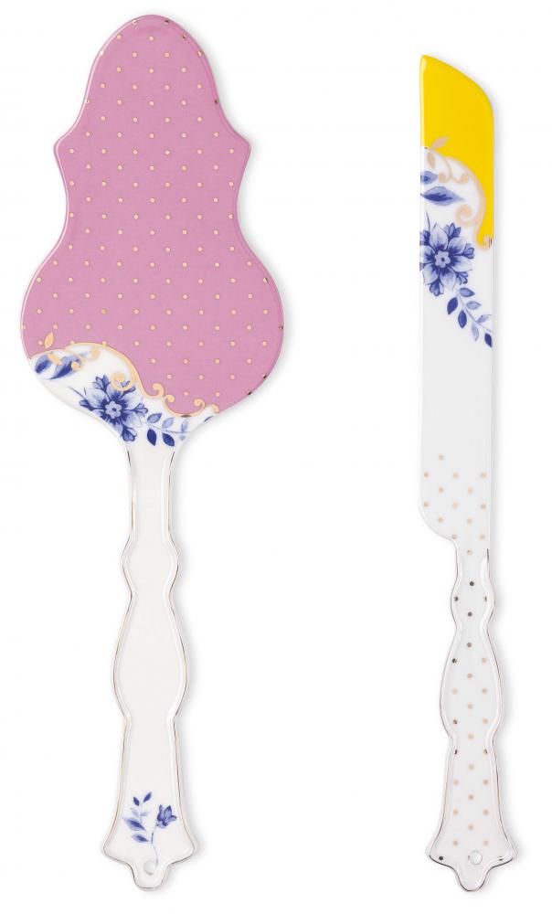 Deze combi van taartschep en mes zit in een cadeauverpakking en is versierd met historische emblemen en vintage, handgeschilderde, veelkleurige bloemen met gouden afwerking.