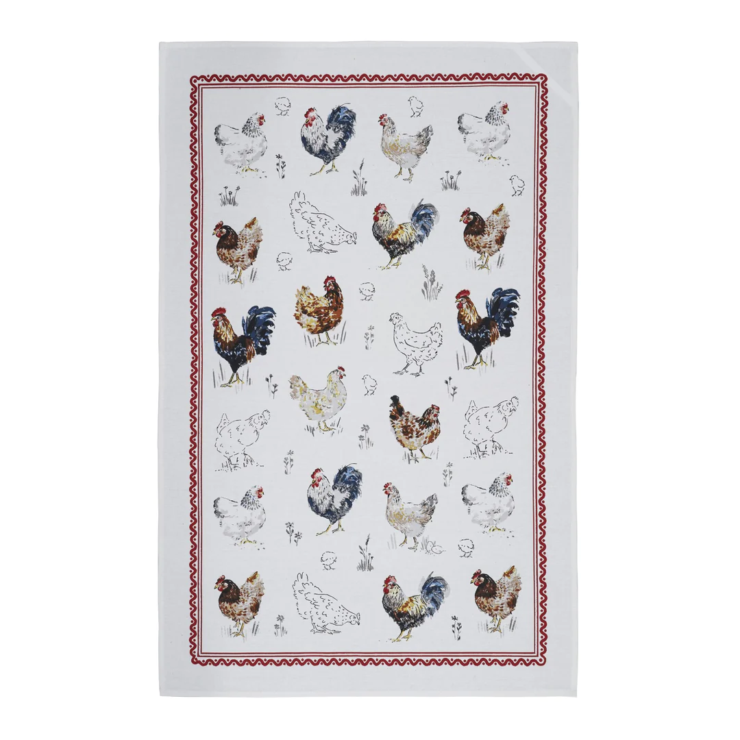 Prachtige handdoek met kuikens, kippen en hanen. 'Farmhouse chic' zouden de Engelsen zeggen.