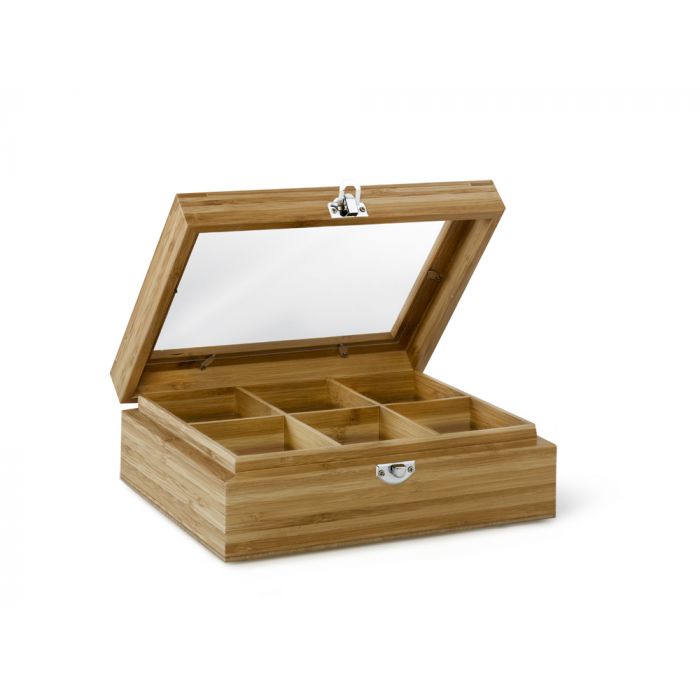 Bewaar en presenteer op een stijlvolle wijze je thee met de Bredemeijer theekist Universal Bamboe 6 vaks. De theekist is gemaakt van bamboe wat zorgt voor een mooie, natuurlijke uitstraling. Dankzij een RVS slotje sluit de theekist goed af en blijft je thee netjes bewaard. De 6 vakken hebben een afmeting van 8 x 6,2 x 5,5 cm. Een musthave voor de echte theeliefhebber!
